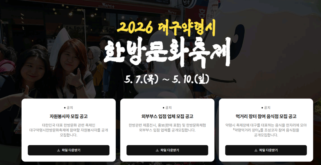 2026년 대구약령시 한방문화축제는 5월 7일부터 5월 10일까지 대구 중구 남성로 약전골목 일원에서 ‘전통 한방의 현대적 재해석’이라는 슬로건 아래 화려하게 펼쳐질 예정입니다.