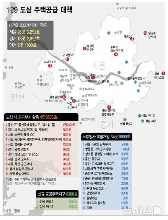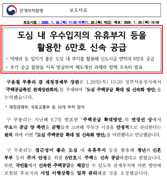 2026년 1월 29일, 국토교통부는 「도심 주택공급 확대 및 신속화 방안」을 통해 서울과 수도권 도심에 총 6만 가구를 공급하는 계획을 발표했습니다.