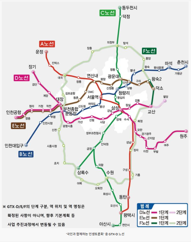 • 현재 상황: 정부는 GTX-D 노선을 포함한 ‘2기 GTX 사업’을 추진 중이며, 이를 2025년 상반기에 발표될 제5차 국가철도망 구축계획(2026~2035)에 확정 반영하는 것을 목표로 하고 있습니다.