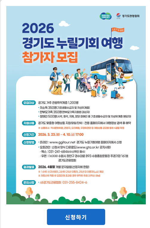 - 경기도와 경기관광협회는 관광 활동에 제약을 받는 도내 관광취약계층에게 여행의 기회를 제공하기 위해 ‘2026 경기도 누릴기회 여행’ 참가자를 모집합니다.