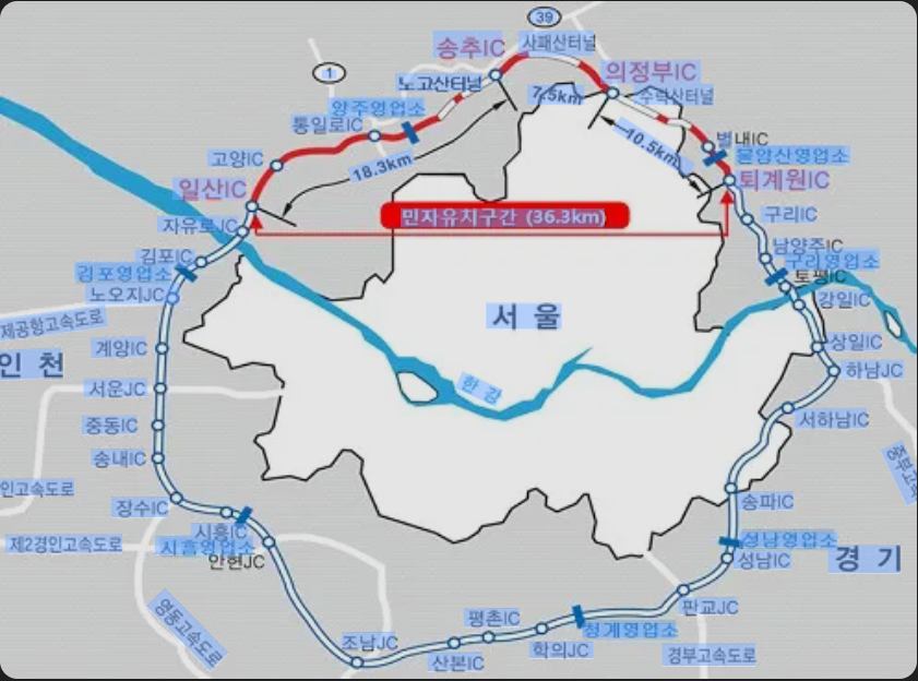 - 남부 구간(한국도로공사 운영): 성남, 청계, 시흥, 김포 등