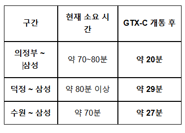 • 주요 정차역: 덕정, 의정부, 창동, 광운대, 청량리, 삼성(핵심), 양재, 과천, 인덕원, 금정, 의왕, 수원 등GTX-C가 완공되면 수도권 남북을 잇는 교통 축이 획기적으로 개선됩니다.